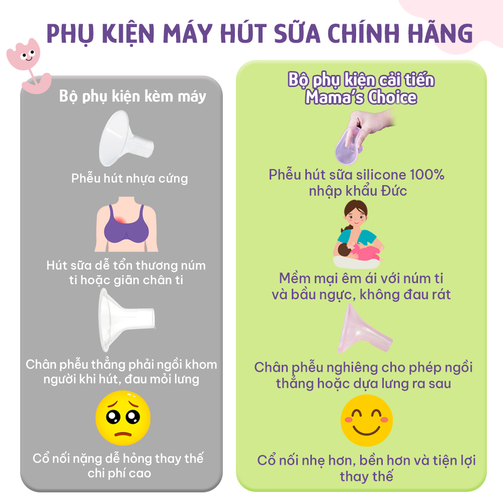 Khi sử dụng Máy Hút Sữa các mẹ sẽ gặp vấn đề về hư hỏng phụ kiện, đau rát với phễu hút sữa khiến mệt mỏi, khó khăn trong việc theo đuổi hành trình nuôi con bằng sữa Mẹ. Hiện tại có rất nhiều loại phụ kiện hút sữa không rõ nguồn gốc, các sản phẩm này được sản xuất ở Việt Nam hoặc Trung Quốc. Do đó nguyên liệu, dây chuyền sản xuất không đảm bảo, khả năng rất cao có chứa chất BPA. Vì vậy, các mẹ nên lựa chọn phụ kiện chính hãng, có thương hiệu để việc hút sữa được an tâm nhất.