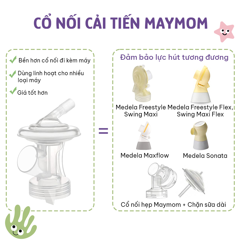 - Phụ kiện cổ nối kèm chặn, van máy hút sữa được sản xuất bởi Maymom kết nối vừa vặn và cải tiến với chất lượng tốt bằng hoặc hơn phụ kiện chính hãng đi kèm máy