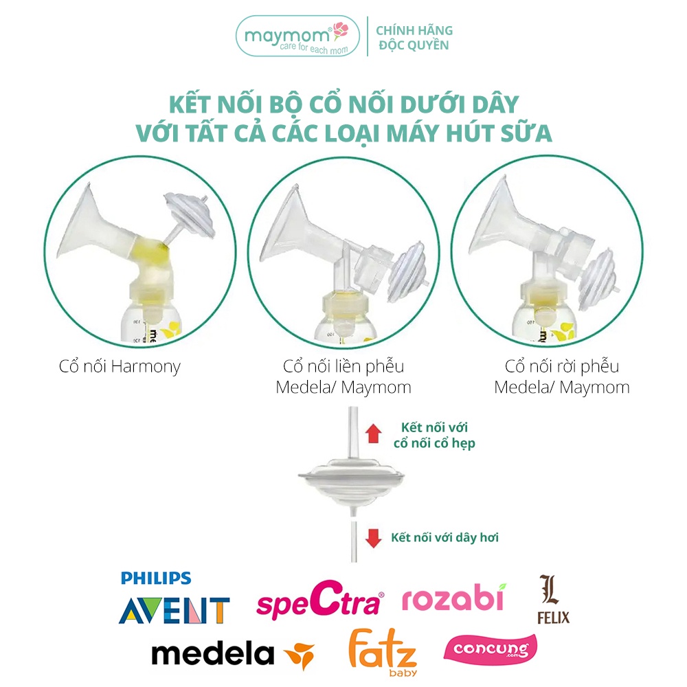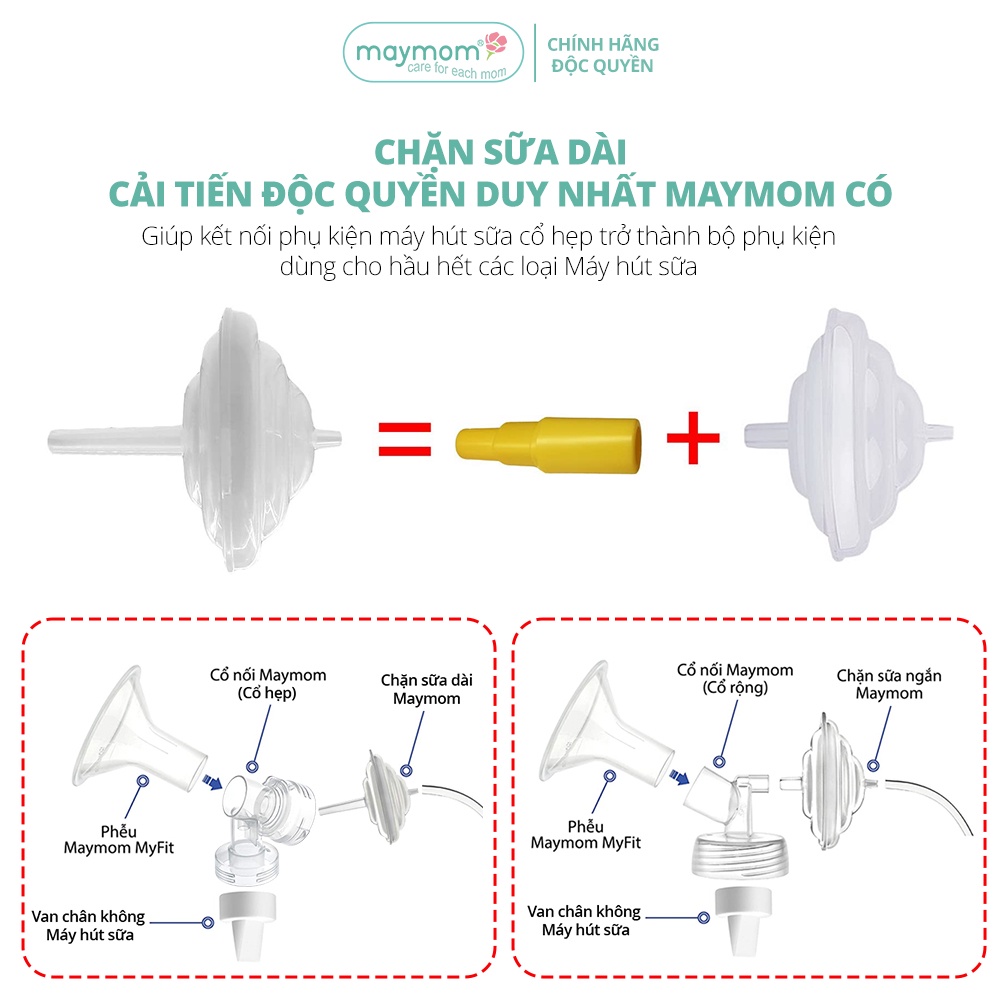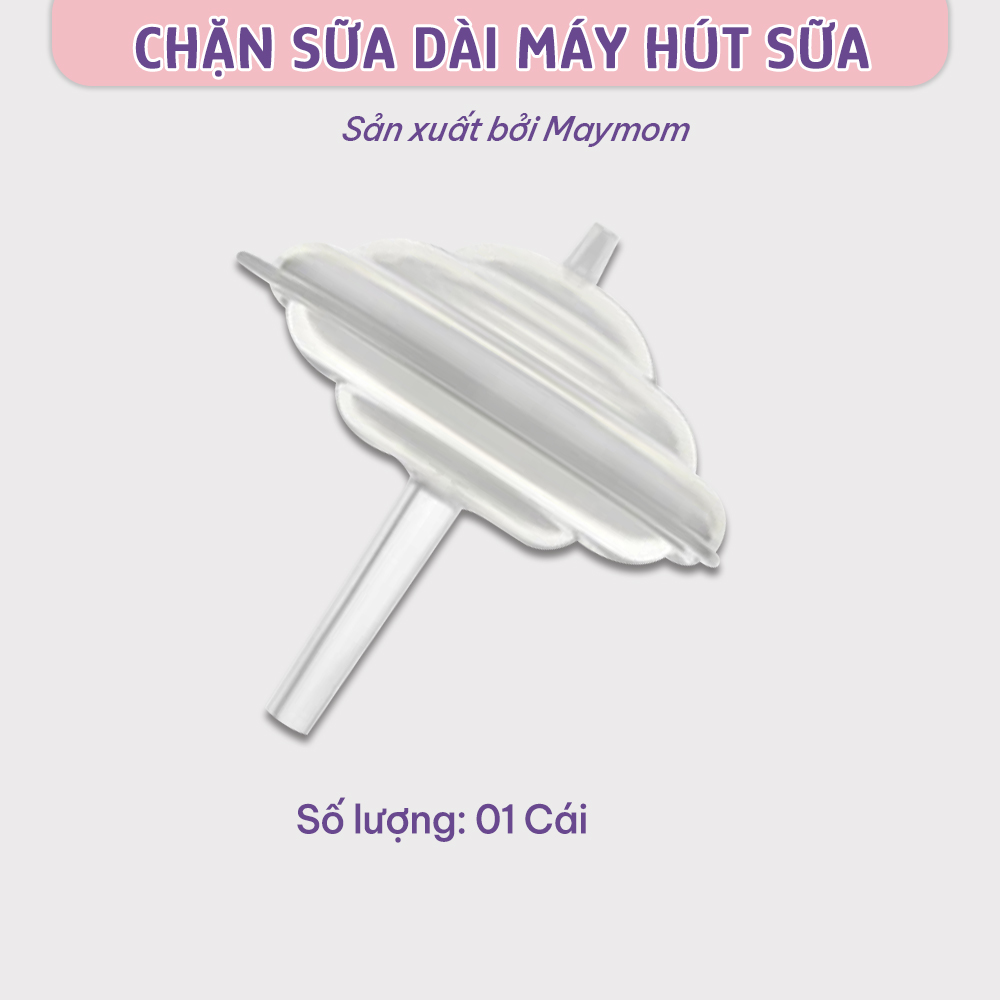 Chặn sữa dài Maymom là phụ kiện máy hút sữa giúp sữa mẹ đi thẳng vào phễu hút sữa, qua cổ nối phễu, qua van chân không và xuống bình trữ sữa mà không bị tràn ngược lại dây hơi vào động cơ máy.