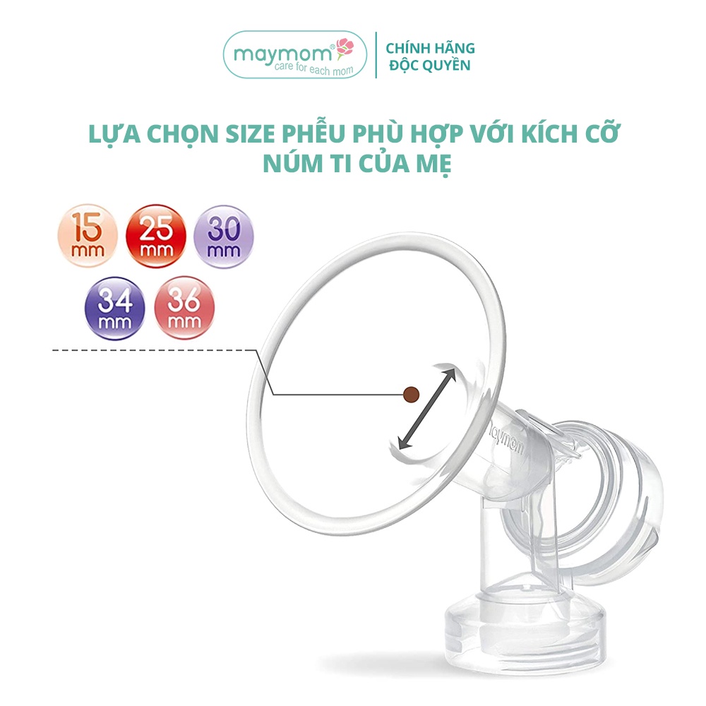 - Có tới 5 size phễu, phù hợp với núm ti của từng mẹ: 15, 25, 30, 34, 36