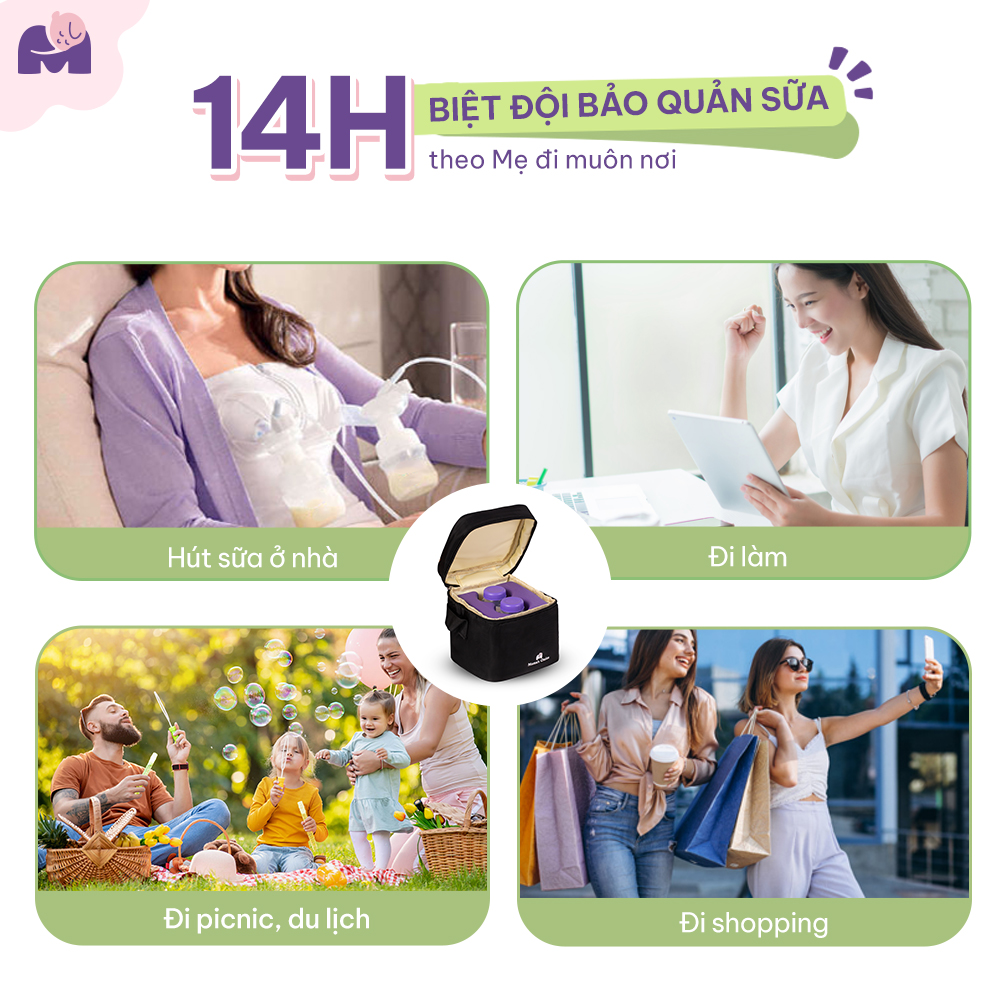 • GIỮ LẠNH: sử dụng với sữa đóng đá trong trủ đông khi mà mẹ và bé chuẩn bị cho 1 chuyến đi xa. Hoặc sữa mẹ mới vắt ra khi mẹ đi làm. Sữa mẹ sẽ được bảo quản lạnh lên đến 14h đồng hồ (tùy thuộc vào nhiệt bên ngoài và đá khô giữ lạnh